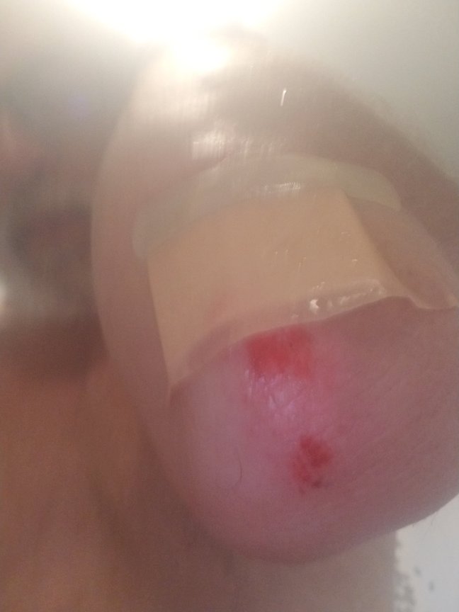 While trying to hang my banner I fell to the sidewalk scraped my elbow and bruised my thigh.