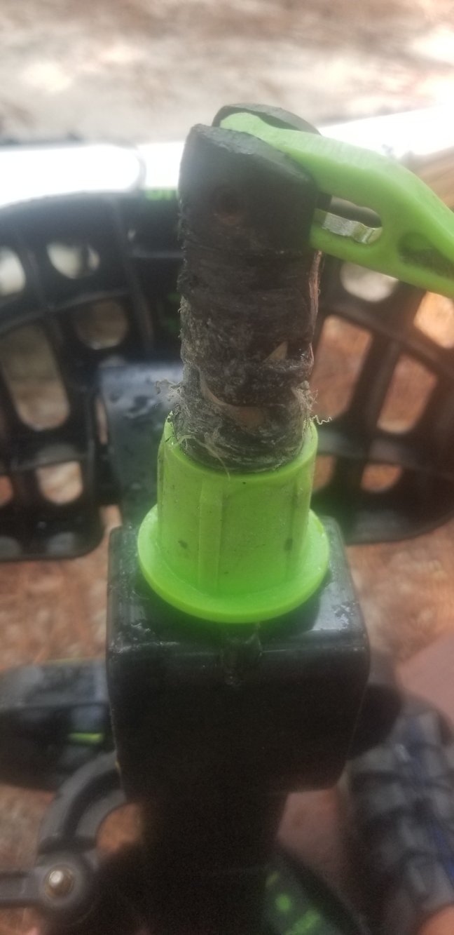 The outer bushing on the other side completely disappeared. A 3/4″ PVC coupling and a piece of water bottle plus a little shaving of the axle did the trick.