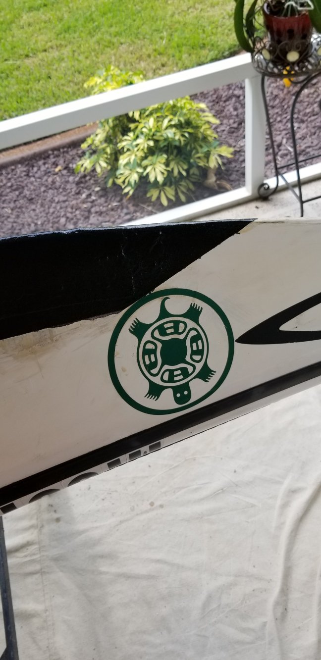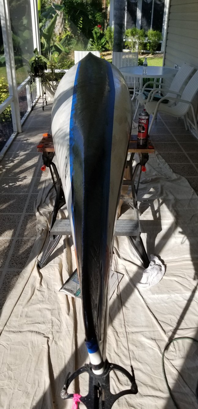Masked off area to be sprayed. I should have also tapped newspaper to cover exposed areas of kayak. Good old acetone cleaned up the overspray nicely.