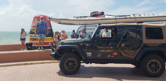 When we got there there was a long line so we came up with a plan to drive around the block park in front of the market and get a pic of me, yak, jeep and marker. I gave CC my phone camera ready and we jumped out. She starts screaming that I just completed 5000 mile paddle from Maine to Key West and we needed my pic in front of marker. People cheered and moved out of the way. It was great. We jumped back in the jeep and went up the road to join Soledad and David.